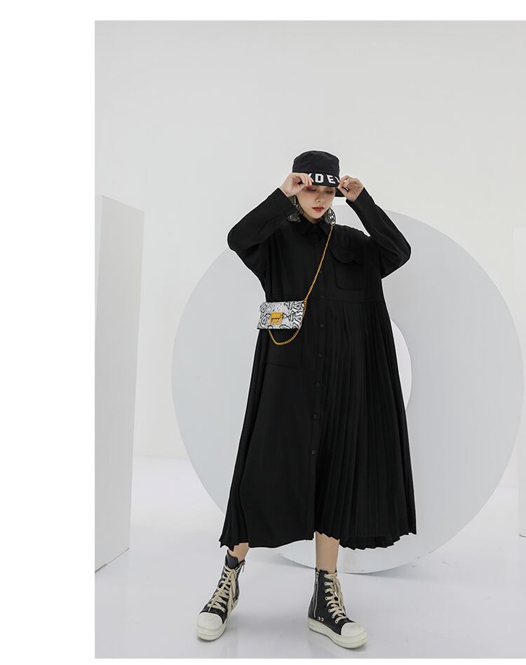 サイドプリーツシャツワンピース ロング ワンピース レディース 春 きれいめ モード系 シャツワンピ マキシワンピース 羽織り 長袖 襟付き プリーツ アシンメトリー 無地 体型カバー 通勤 オフィス C264