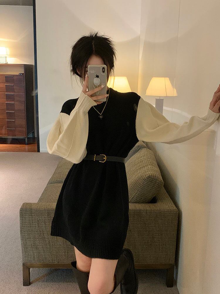 フレンチニットワンピ レディース バイカラー ニットワンピース ドッキングワンピ 長袖 ワンピース ドレス 着痩せ 可愛い 通学 デート お出掛け a4695