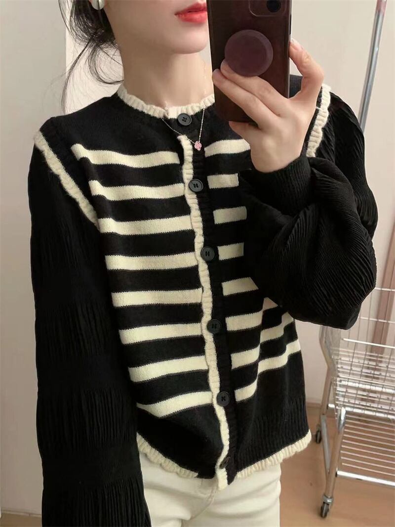 ボーダーカーディガン 異素材カーディガン パフスリーブ. カーディガン レディース ストライプ レイヤード風 ニットカーディガン お仕事コーデ ママコーデ デート 可愛い 2カラー C363