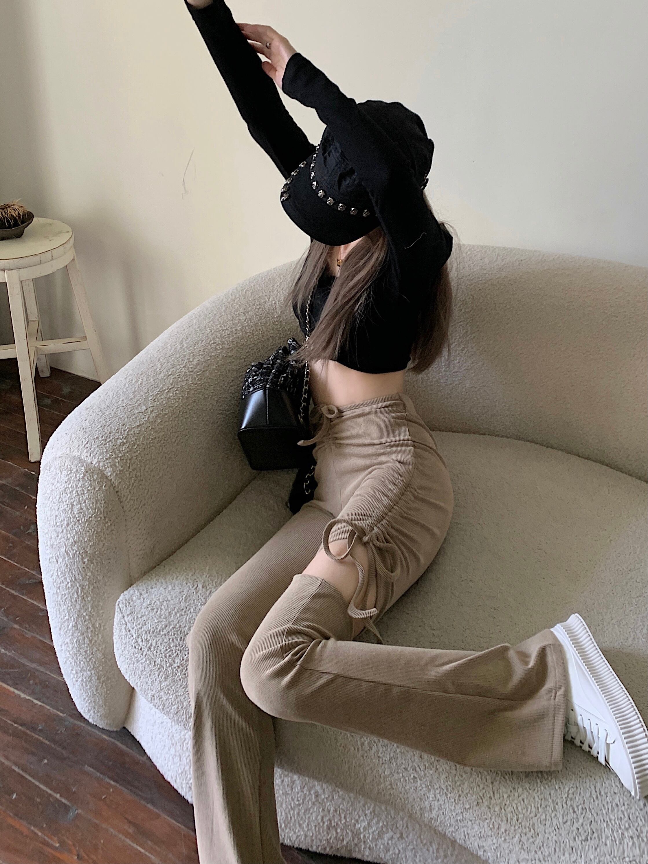 人気のカットアウトデザインにシャーリング加工が可愛いカジュアルパンツ