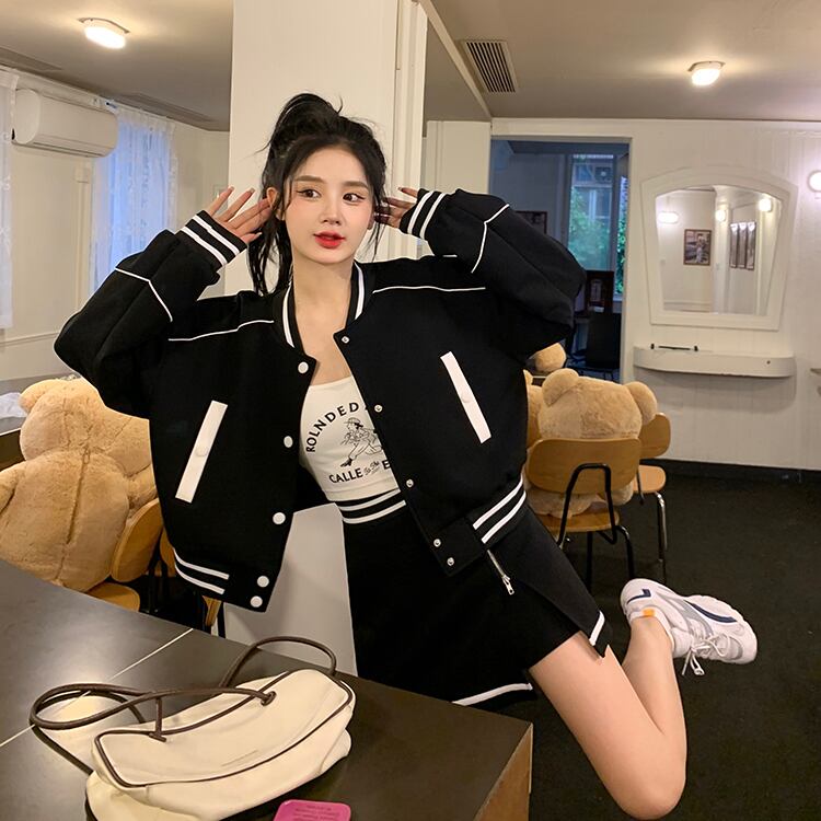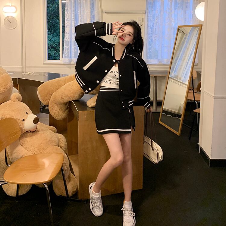 【セットアップ】スタジャン+ミニスカート ブルゾン スカート スタジャン set up 上下セット ツーピース レディース 可愛い オルチャン カジュアルストリート アメカジコーデ 3カラー C366
