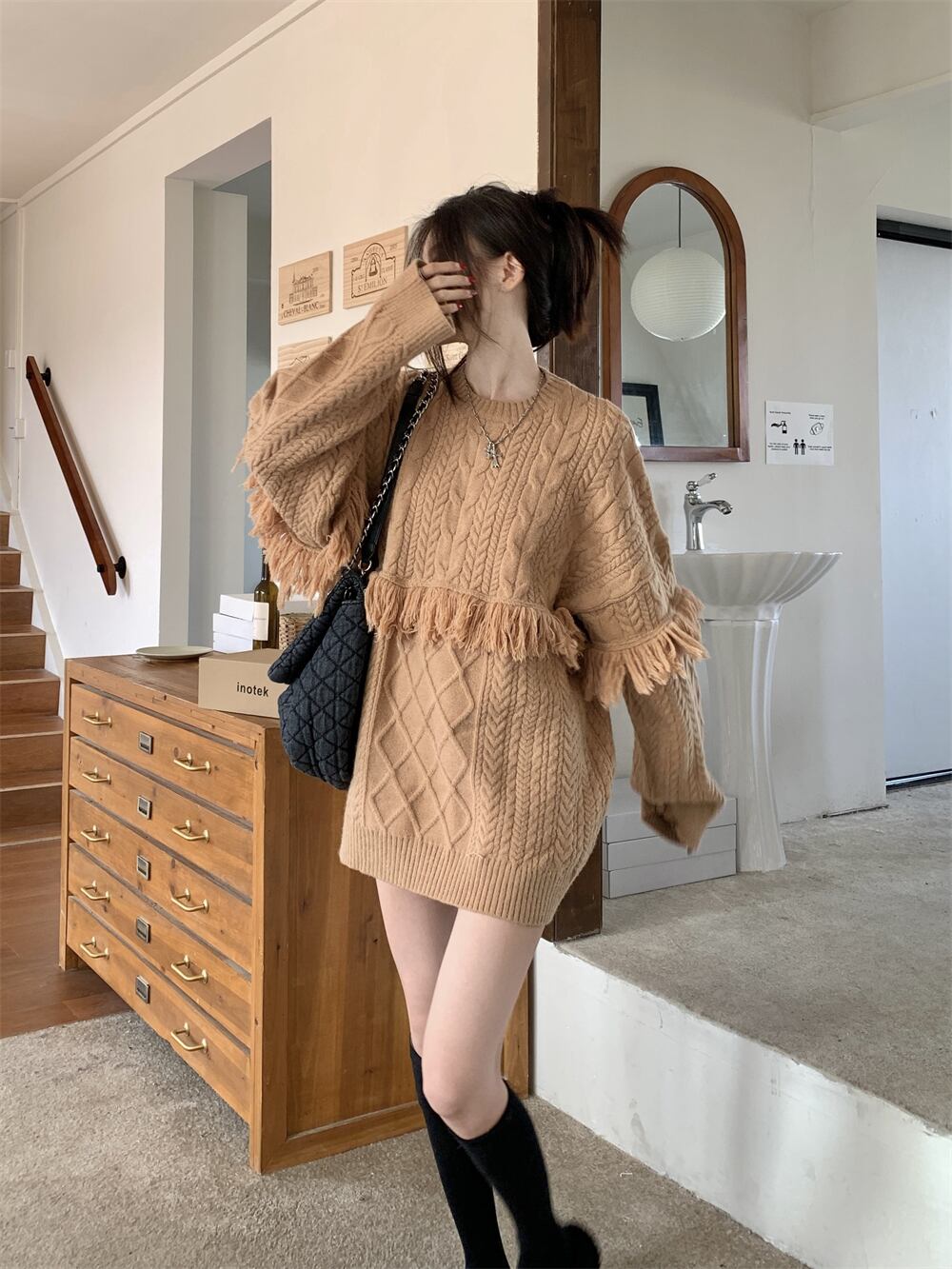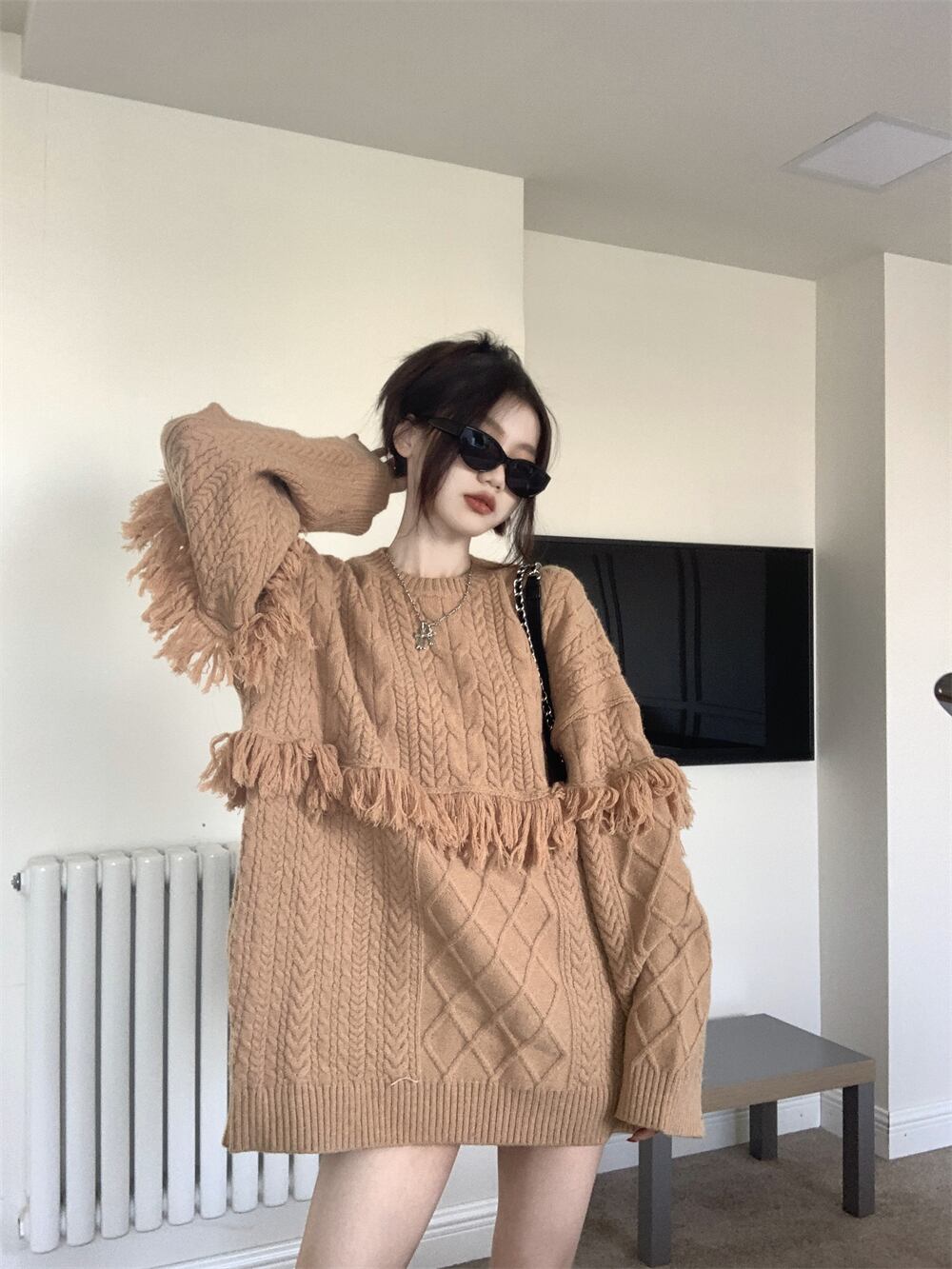 フリンジツイストニット ニット セーター トップス レディース プルオーバー オーバーサイズ フリンジニット ミドル丈 可愛い 萌え お出掛け デート ニットワンピース 2カラー D113