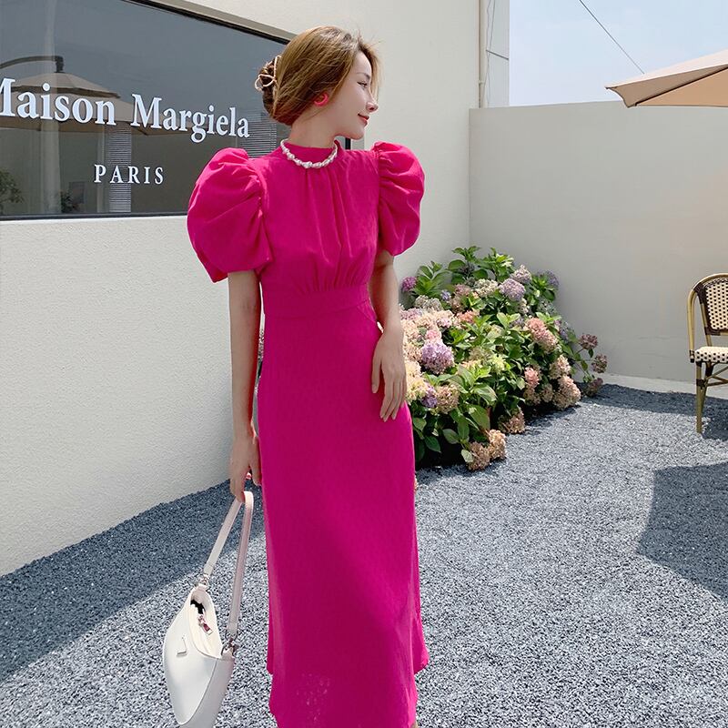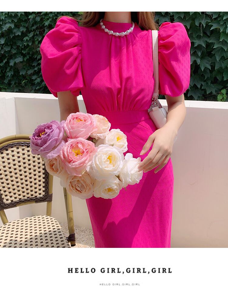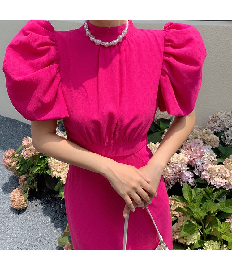 バックリボンワンピース レディース ミモレ丈 ドレス ワンピース 袖あり 半袖 パフスリーブ ハイネック ギャザー オープンバック バックリボン リボン バックシャン ビビッドカラー ローズレッド ピンク かわいい お呼ばれコーデ パーティー a4735