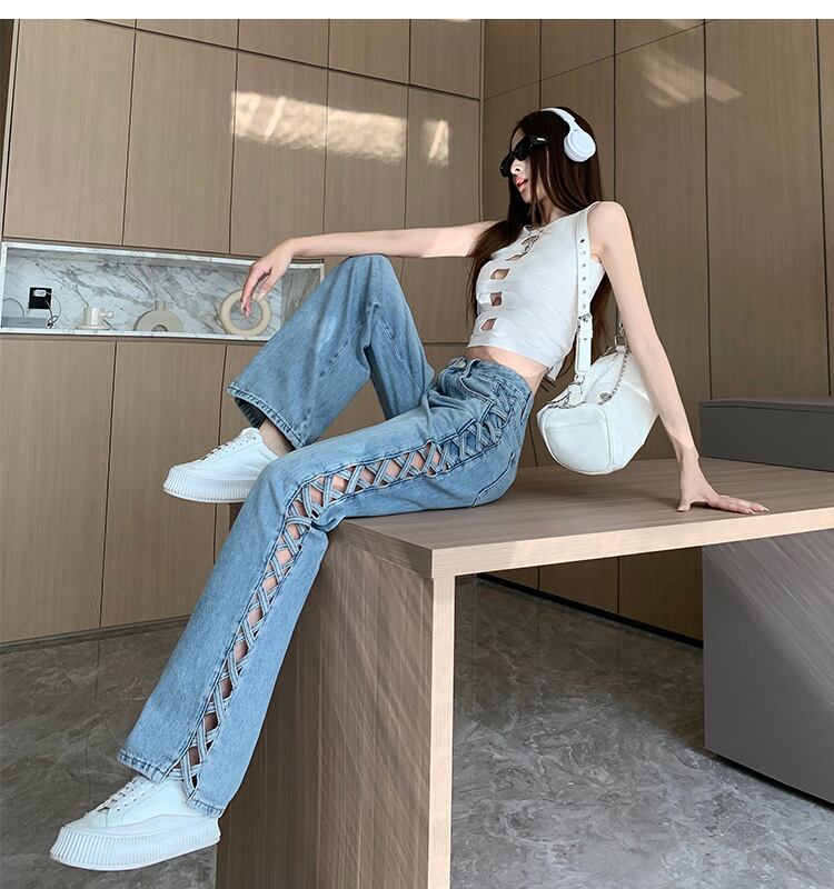 サイドレースアップジーンズ ストレートジーンズ. レースアップジーンズ. ハイウエスト. ジーンズ. デニム レディース 美脚 トレンド. 可愛い オシャレ アメカジコーデ カジュアル ストリート 海外コーデ D515