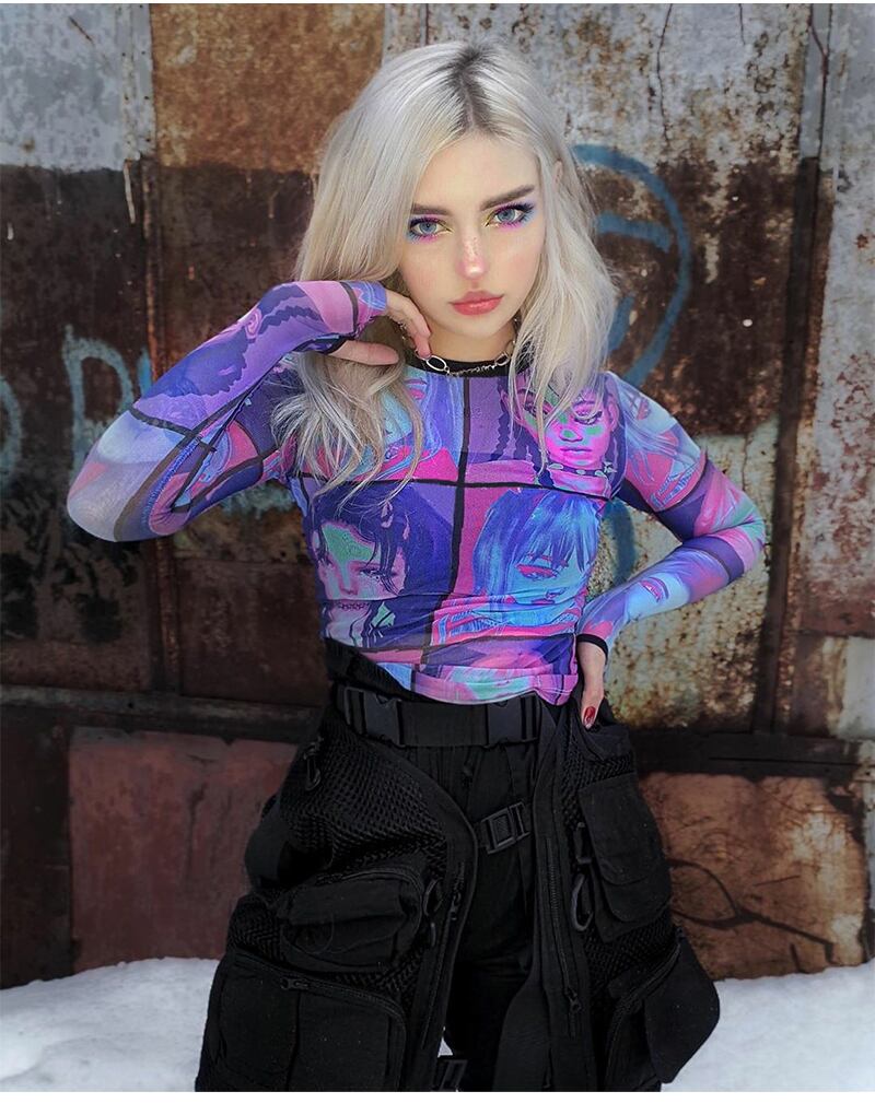 アニメプリントメッシュトップス 長袖 Tシャツ カットソー トップス レディース アニメ 可愛い レディース 原宿 トレンド オシャレ C354