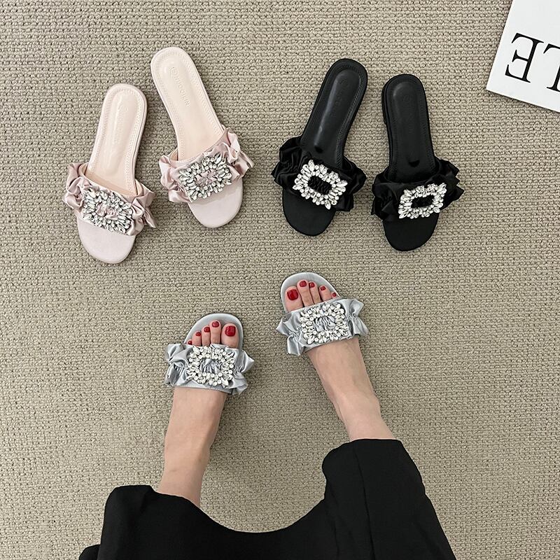 フリルビジューフラットサンダル ミュール サンダル フラットサンダル レディースサンダル ビジュー キラキラ サテン 可愛い 春 夏 秋 オシャレ 3カラー a4651