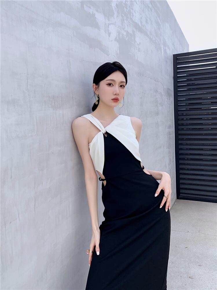 バイカラーワンピース ロングワンピース クロス サイドカット セクシー 上品 シック モノトーン ドレス ワンピース レディース サマーワンピ パーティー お呼ばれ a4993