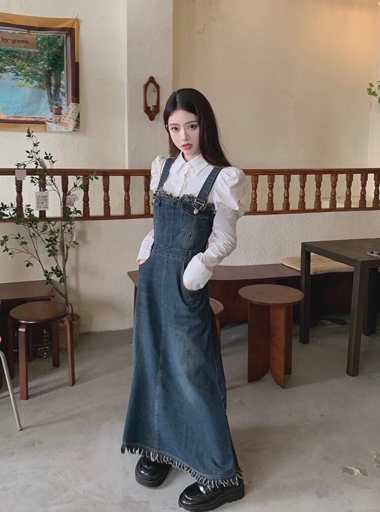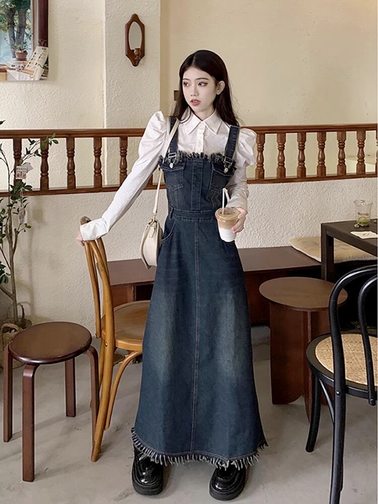 【セット】デニムワンピース+ホワイトシャツ. セットアップ レイヤードコーデ フリンジデニムワンピース. 長袖シャツ サスペンダーデニムワンピース デニムワンピ レディース 可愛い デート a4693