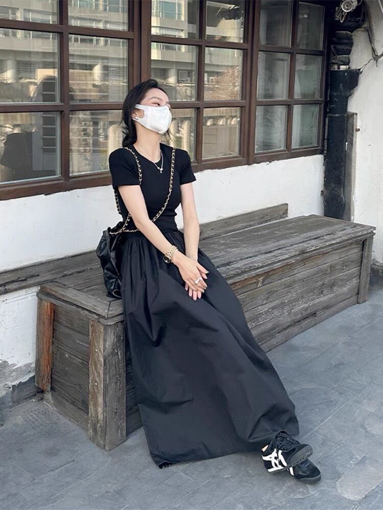 ドッキングワンピース. 異素材MIXワンピース ウエスト切り替え 半袖 ラウンドネック. レディース ブラックワンピース ワンピース ドレス 体型カバー ロングワンピース a4977