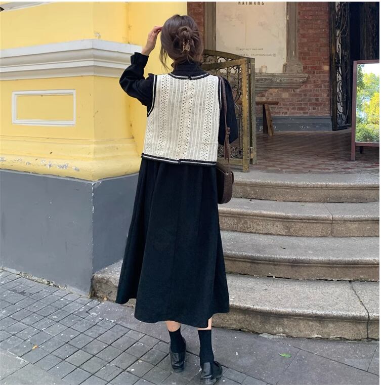 【2点セット】刺繍ニットベスト+フリルワンピース set up ワンピース ニットベスト フリルワンピース ガーリー レトロ 古着女子 着回しコーデ ベスト+ワンピース デート ママコーデ マタニティーコーデ C219