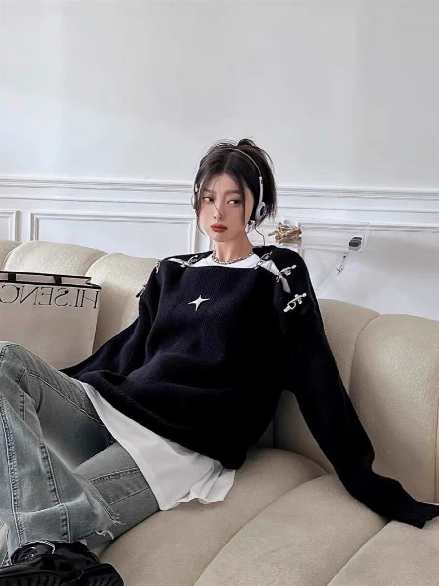 バックル付きセーター カットアウトニット トップス セーター ニット ルーズ 秋冬 オフショルダー ビッグネック Y2k 肌見せニット レディース 可愛い オシャレ a5032