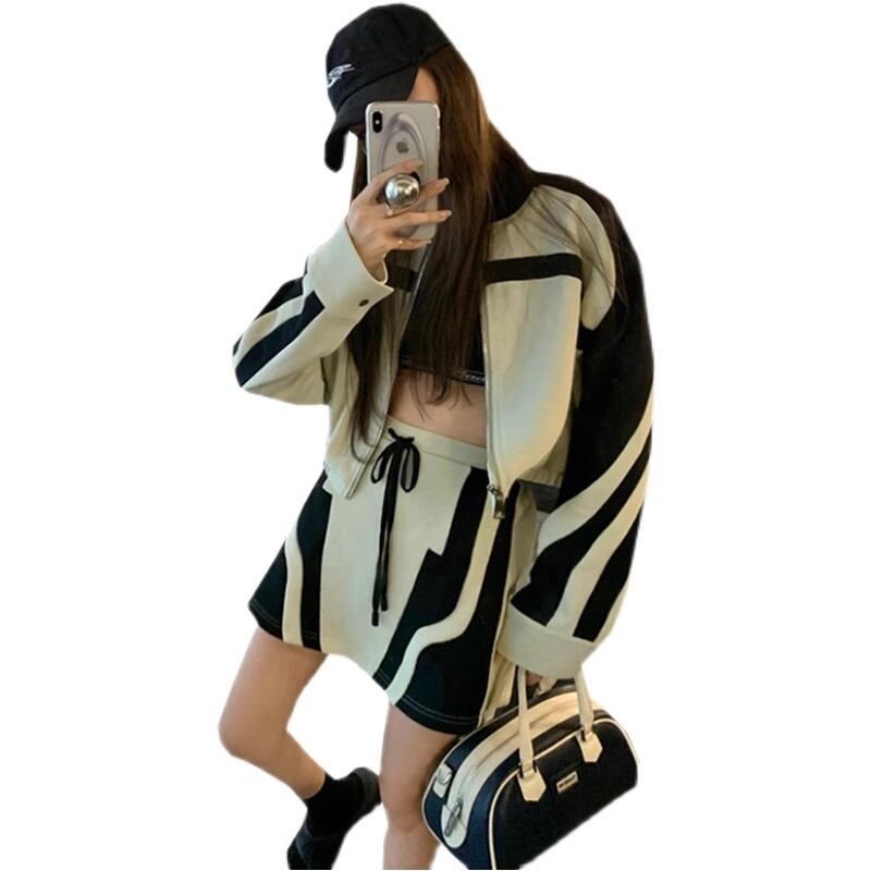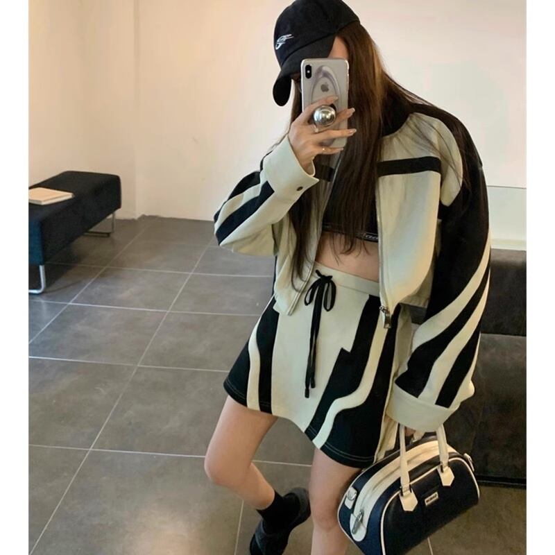 【セットアップ】ゼブラ柄風 ショートジャケット+ミニスカート set up 2点セット ブルゾン ミニスカート スカート バイカラー 配色 ライン スポーティー a5026
