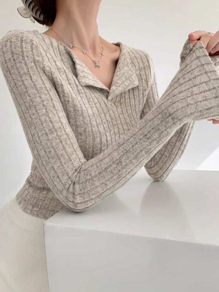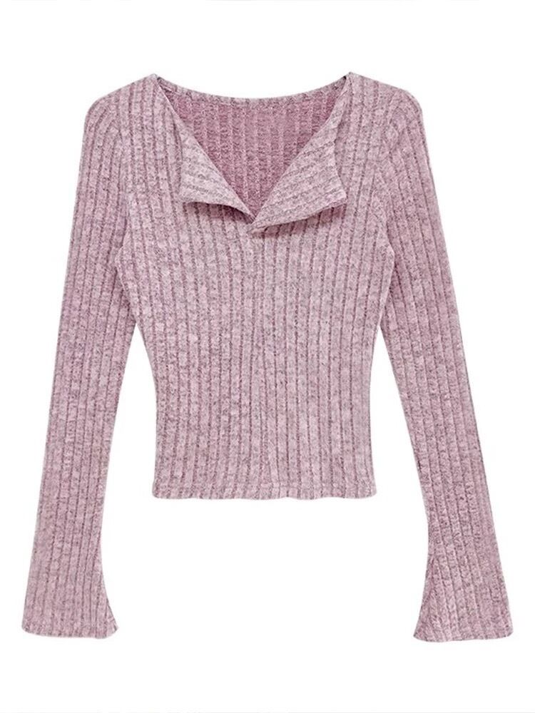 Vネックリブニット ボトミングニット トップス ニット セーター トランペットスリーブ 長袖ニット レディース 可愛い オシャレ 春 夏 秋 冬 a5054