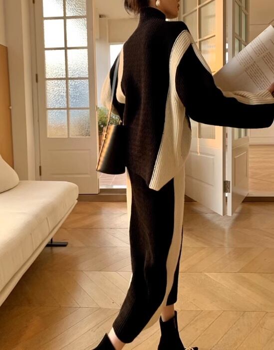 【セットアップ】バイカラー ハイネックニットセーター+ニットスカート