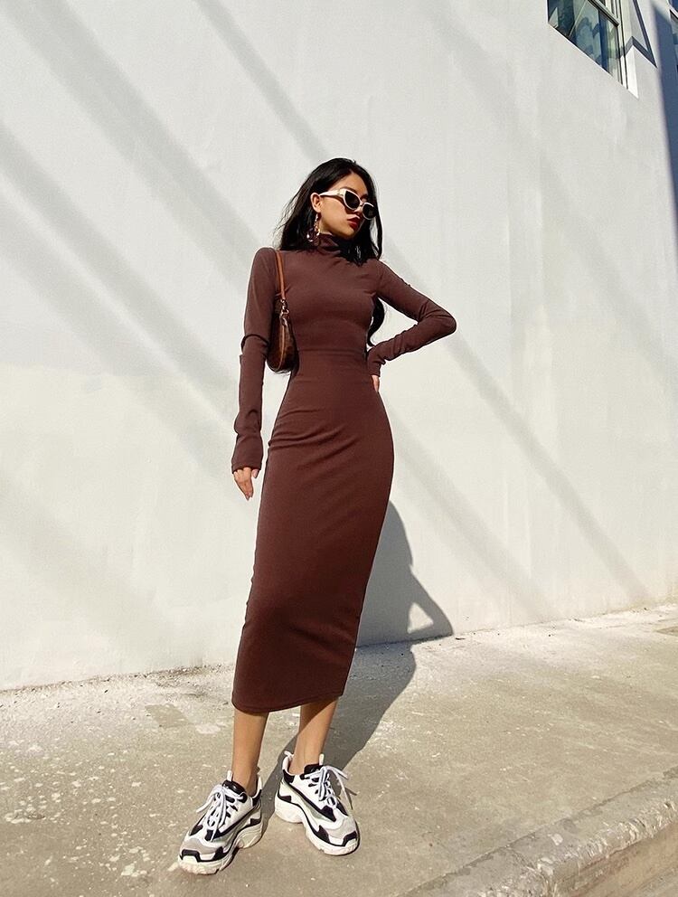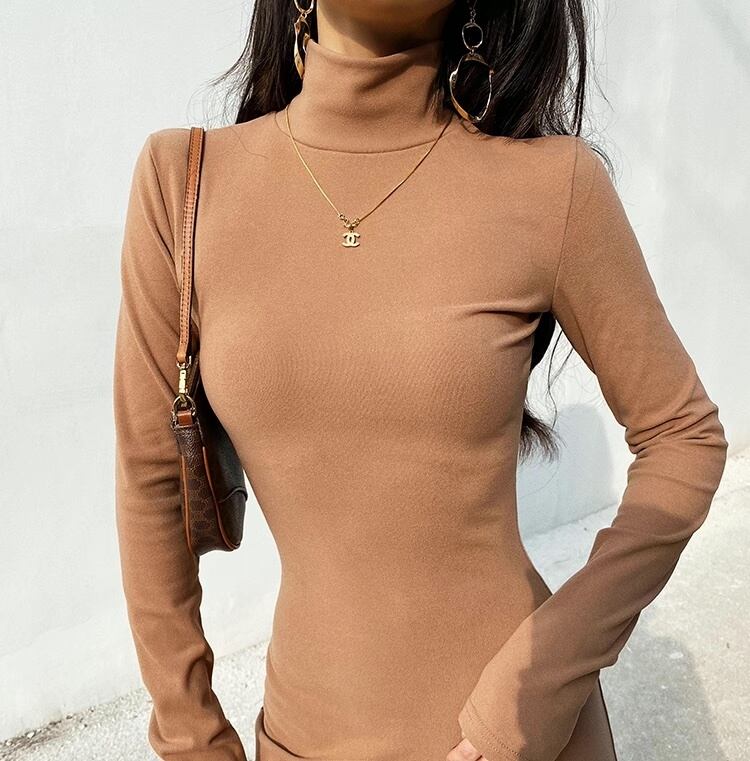 ハイネックワンピース タイトワンピース 長袖 タイトワンピ ワンピース ドレス スタイルアップ レディース ミディワンピース アメカジコーデ カジュアル ストリートコーデ デート a4663