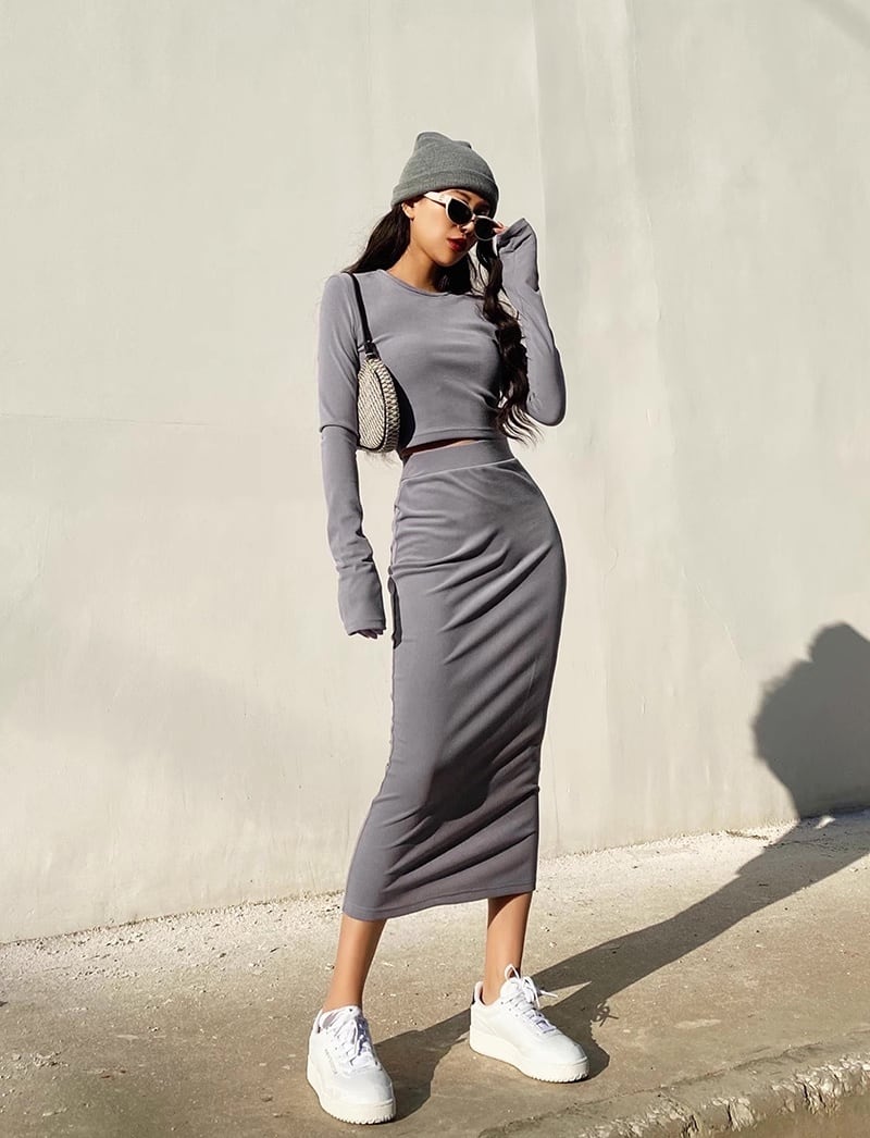 シンプルなtopsに、スカートはボディラインを美しく引き立てるタイトなミディスカート。