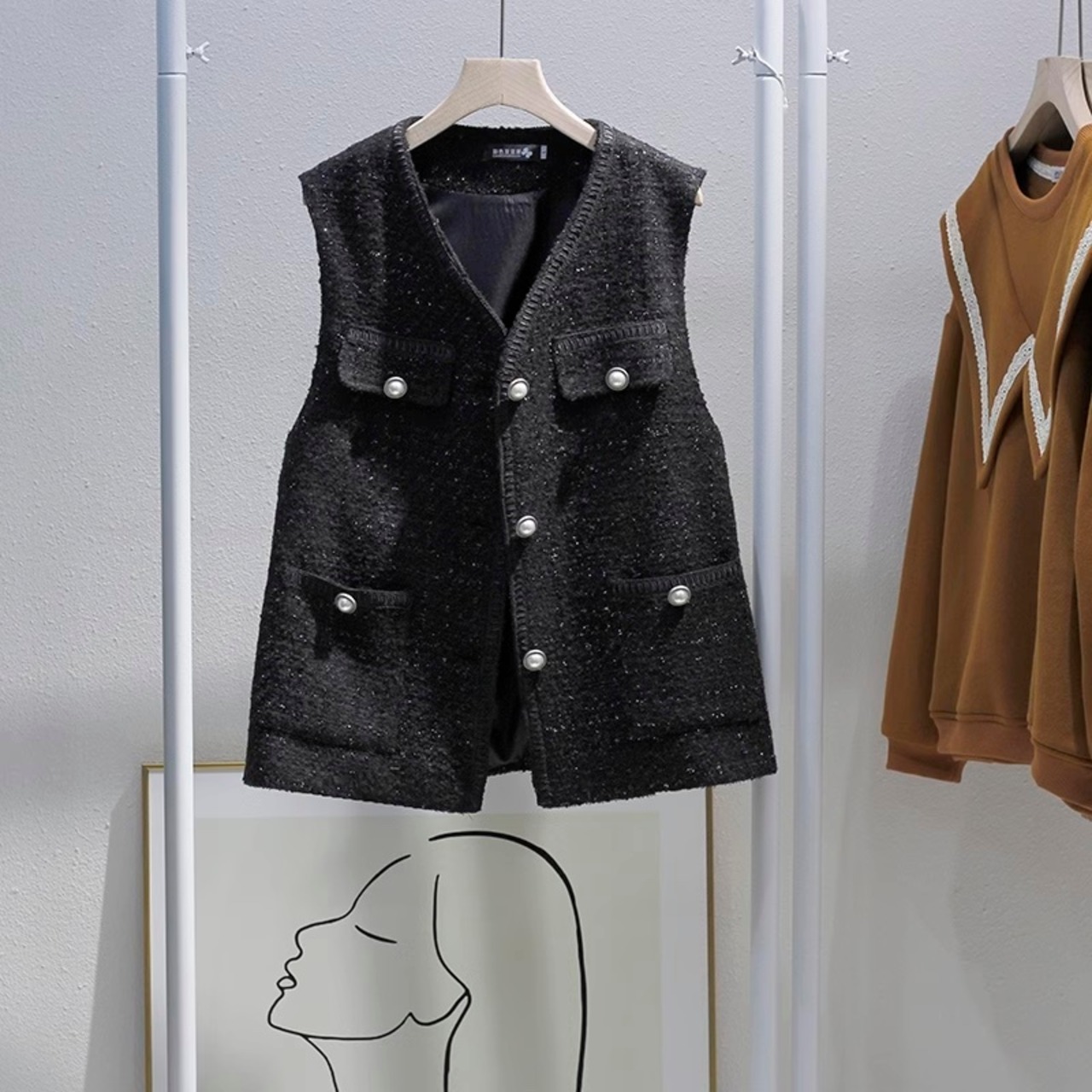 【L-3XL】Vネックツイードジレ ツイードジレ ツイード パールボタン ジレ ベスト トップス レディース ショート コート レディース 春 秋 冬 オフィスコーデ ママコーデ 体型カバー a4873