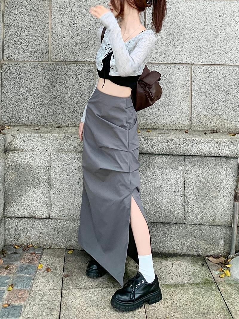 モダンフェミニンな着こなしが決まるスリット入りロングスカート