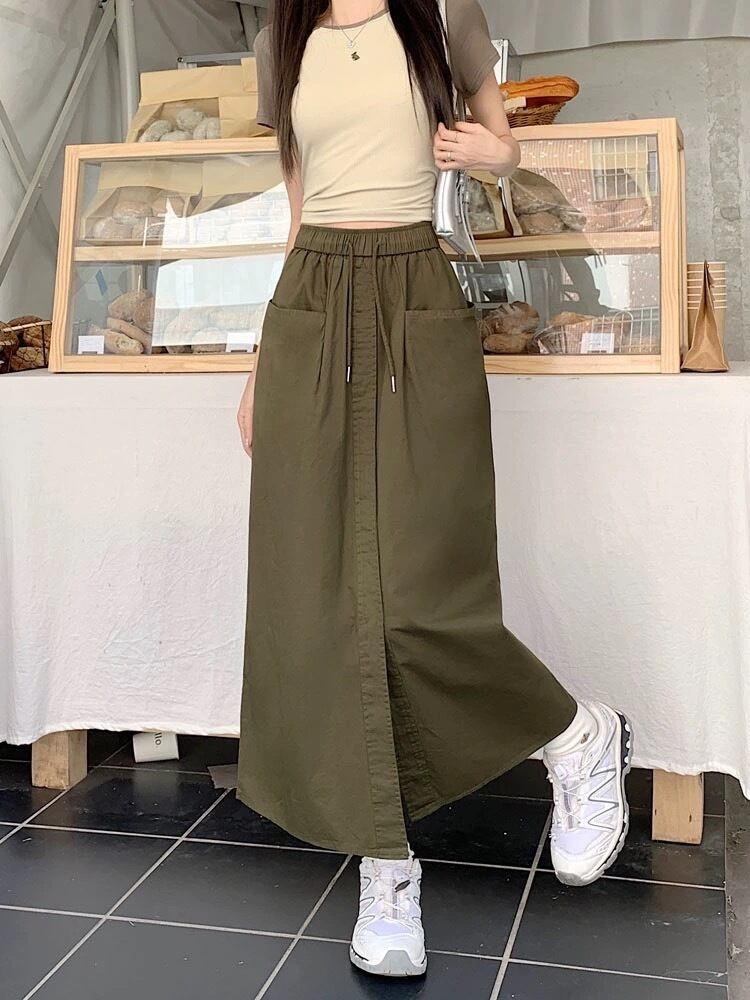 スリット入りロングスカート ロングスカート ハイウエスト ウエストゴム カーゴスカート スカート スカート マキシ丈 黒 ポケット付き レディース 春 夏 秋 ミリタリー ストリート カジュアル ブラック 春 ミリタリースカート a4732