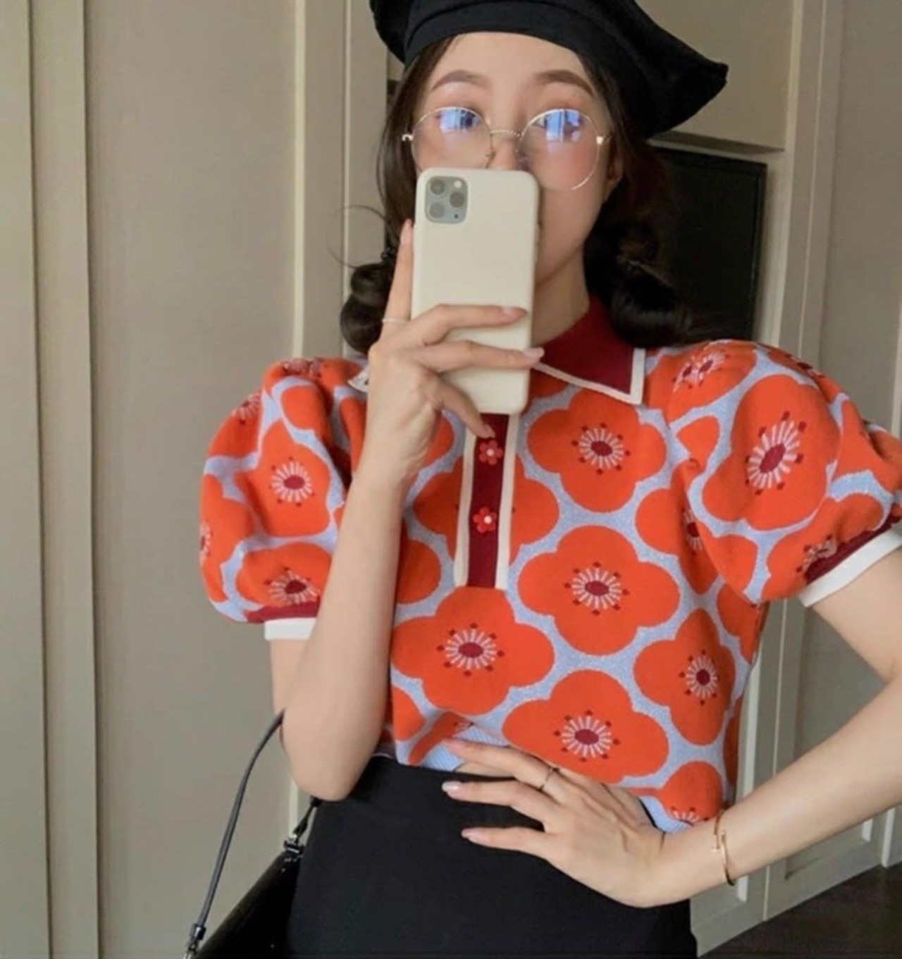 花柄半袖ニット サマーニット 半袖ニット ポロニット トップス レディース 可愛い パフスリーブ ポロシャツ 襟付きニット セーター ニット Tシャツ a4746
