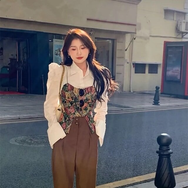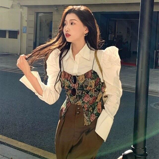 【セット】花柄ビスチェ+パフスリーブシャツ