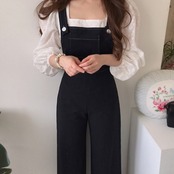 【M早めの発送】ブラックサロペット オーバーオール ロングパンツ ワイドパンツ ハイウエスト ワイドレッグ サスペンダー ジャンプスーツ パンツ a4299