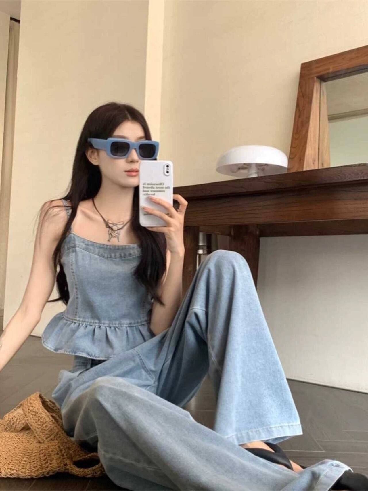 キャミソールとデニムパンツの組み合わせは、デートやお出かけにぴったりです。